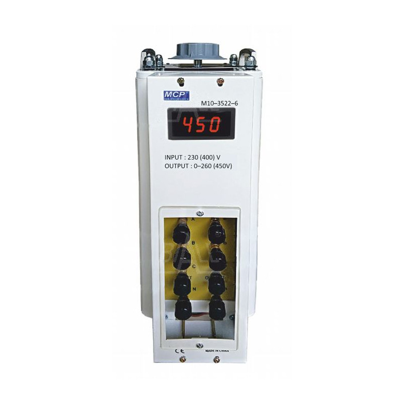Autotransformatory z serii M10-3522LED wyposażone są w cztery zaciski laboratoryjne L1,L2,L3,N zarówno na wejściu jak i na wyjściu oraz w gniazdo uziemienia znajdujące się na obudowie. Napięcie wyjściowe regulowane jest przez duże, antypoślizgowe pokrętło. Na obudowie znajduje się skala . Napięcie wyjściowe jest zwiększane liniowo w miarę przekręcania pokrętła zgodnie ze wskazówkami zegara a na wyświetlaczu LED wskazywana jest jego wartość .