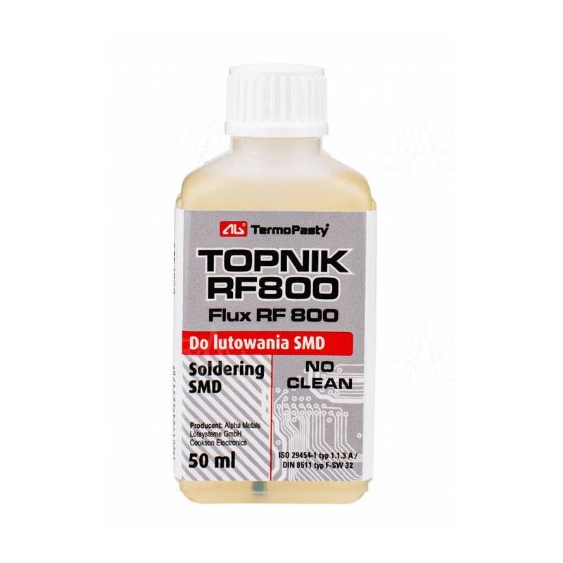 RF800 to średnioaktywny topnik kalafoniowy w butelce 50 ml z pędzelkiem, przeznaczony do montażu SMD i THT.