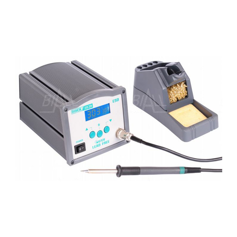 303D to cyfrowy model stacji lutowniczej firmy Quick wyposażony w elektromagnetyczny element grzejny o mocy 120W, z zakresem temperatury pracy 50C~500C oraz szeregiem funkcji ułatwiających użytkowanie, takich jak: nastawy temperatury zabezpieczone hasłem, przechodzenie w stan uśpienia, cyfrowa kalibracja temperatury,komunikaty usterek ,szybka wymiana grotów. Stacja przeznaczona zarówno do zastosowań serwisowych i przemysłowych