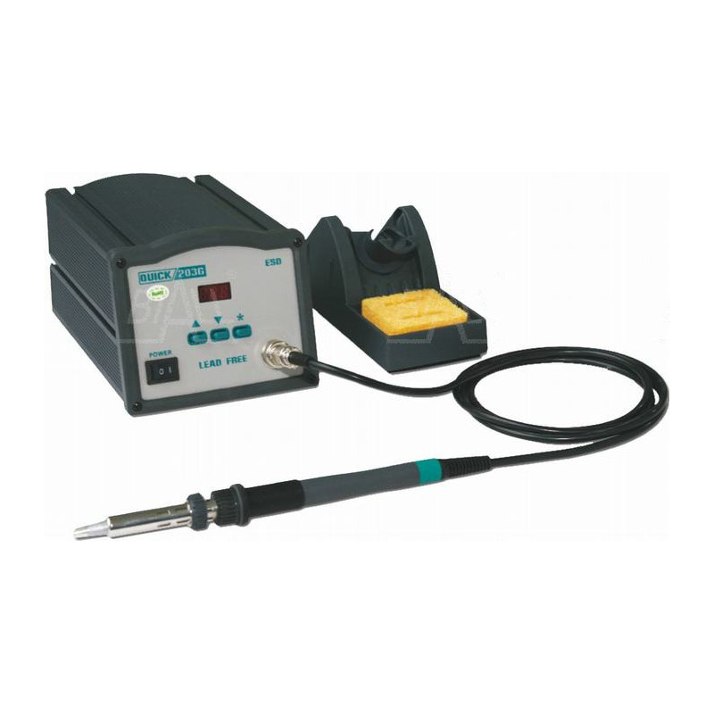 203G to model stacji lutowniczej dużej mocy firmy Quick wyposażony w element grzejny zasilany prądem wysokiej częstotliwości o mocy 150W, z zakresem temperatury pracy 50C~600C oraz szeregiem funkcji ułatwiających użytkowanie, takich jak: nastawy temperatury zabezpieczone hasłem, przechodzenie w stan uśpienia, cyfrowa kalibracja temperatury.groty o dużej pojemności cieplnej. Stacja przeznaczona zarówno do zastosowań serwisowych i przemysłowych.
